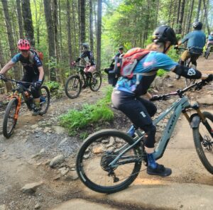 Il est fréquent de s’arrêter pour ajuster le vélo, pratiquer certains mouvements ou marcher les obstacles. L’objectif est de découvrir le vélo de montagne, développer la confiance et apprendre les bases dans un environnement sécurisant.